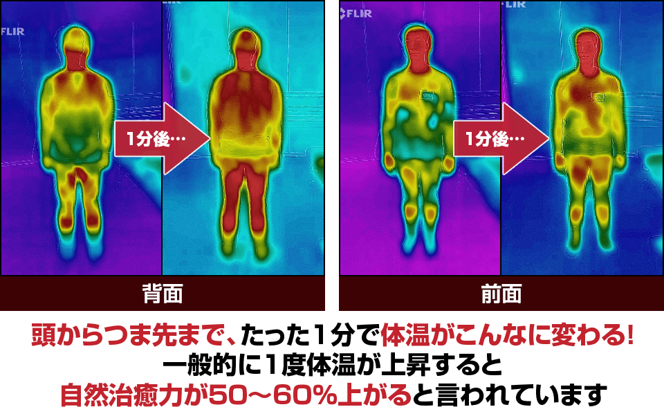体温が上昇すると人間本来の免疫システムの働きが促進するので、自然治癒力が引きあがります。一般的に1度の体温上昇で自然治癒力は50%~60%も上昇すると言われています。