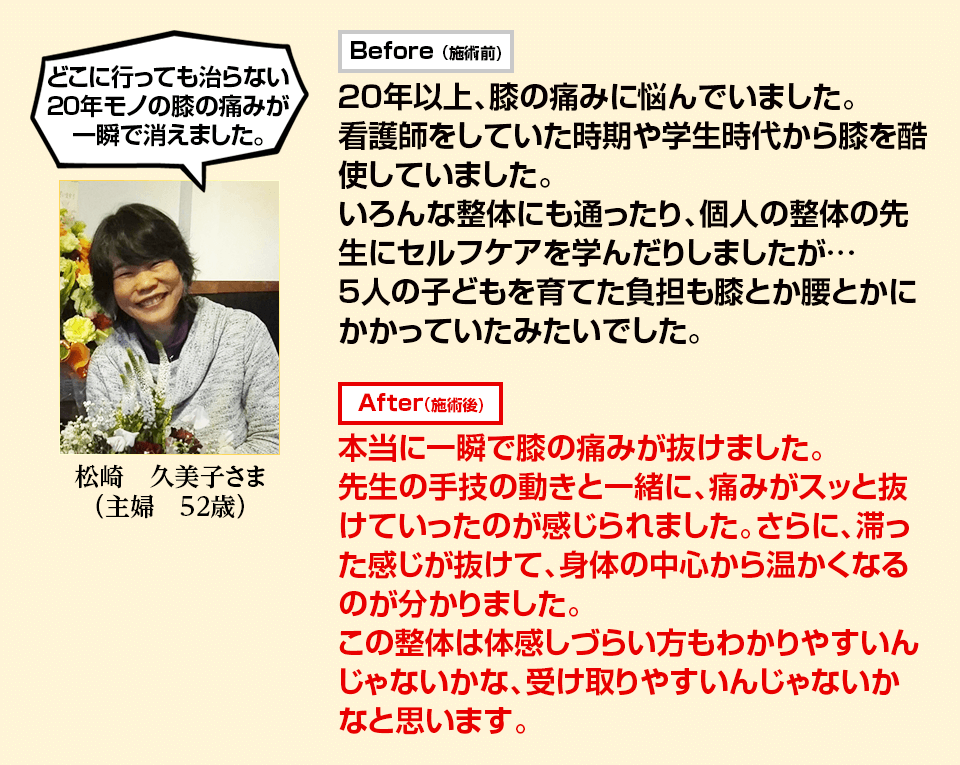その即効性のある安全な療法と何時もニコニコ笑顔で気さくな人間性に魅力を感じて